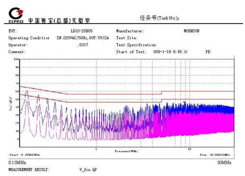 5. 具有較低的EMI性能。EN55011有l(wèi)evel B,level A兩個等級,level B比level A嚴苛得多。圖2、圖3是LD10產品的EMI測試數(shù)據(jù),該數(shù)據(jù)由國家電子五所專業(yè)測試。測試結果可以看出,該系列電源具有較低的電磁輻射性能,達到EN55011,level B的要求。