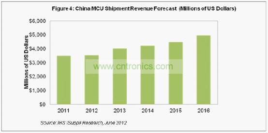 2012年中國MCU市場營業(yè)收入將達(dá)到35.3億美元,僅略高于2011年的34.9億美元。但是,到2016年,中國MCU市場將達(dá)到49.5億美元,預(yù)測期內(nèi)的復(fù)合年度增長率為7.3%,如圖4所示。
