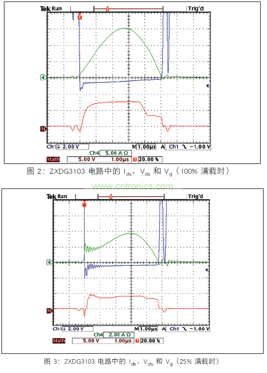 在滿載測(cè)試電路中,柵極驅(qū)動(dòng)電壓在正弦電流開(kāi)始減少時(shí)早期終止,這可能是由電路的電感和 Q1 TO-220 封裝的電感造成的。 與前面使用 ZXGD3103 的測(cè)試一樣,對(duì)布局進(jìn)行改進(jìn)、減少阻抗和選擇低電感的封裝應(yīng)該可以解決此問(wèn)題。