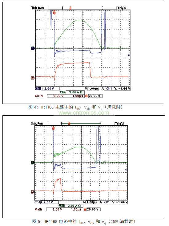 在這兩個(gè)圖中,令人關(guān)注的是快速柵極驅(qū)動(dòng)電壓。在探測(cè)到寄生二極管在 MOSFET 中的正向壓降之后約 200 納秒內(nèi),Q1 打開(kāi),減少其電壓 (Ch1 - Vds)。 在這兩個(gè)測(cè)試中,Q1 Vds 均高于預(yù)期。 這可能由電路電感和示波器的容量造成的。在滿載情況下,柵極驅(qū)動(dòng)電壓在正弦電流開(kāi)始減少時(shí)下降。這可能是電路的電感和 Q1 TO-220 封裝的電感造成的。對(duì)布局進(jìn)行改進(jìn)并選擇低電感的封裝應(yīng)該可以解決此問(wèn)題。