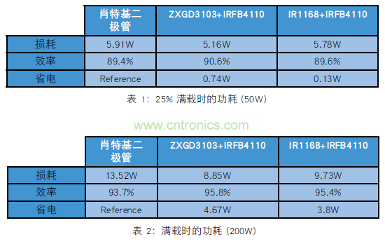 對(duì)布局進(jìn)行改進(jìn)并選擇低電感的MOSFET封裝后,兩個(gè)同步整流電路展示了更高的效率;因此,表中所示的 ZXGD3103與 IR1168 電路之間的略微差別不是嚴(yán)重問(wèn)題。令人清楚的一點(diǎn)是,通過(guò)遵照制造商的應(yīng)用指南,在實(shí)施設(shè)計(jì)不太完美的電路后是有可能大幅度節(jié)省電源的。