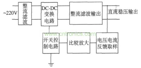 開關(guān)直流穩(wěn)壓電源是基于方波電壓的平均值與其占空比成正比以及電感、電容電路的積分特性而形成的。其基本工作原理是,先對(duì)輸入交流電壓整流,從而形成脈動(dòng)直流電壓,經(jīng)過(guò)DC-DC 變換電路變壓,再通過(guò)斬波電路形成了不同脈沖寬度的高頻交流電,然后對(duì)其整流濾波輸出需要電壓電流波形。如果輸出電壓波形偏離所需值,便有電流或電壓采樣電路進(jìn)行取樣反饋,經(jīng)過(guò)與比較電路的電壓值進(jìn)行參數(shù)比較,把差值信號(hào)放大,從而控制開關(guān)電路的脈沖頻率f 和占空比D,以此來(lái)控制輸出端的導(dǎo)通狀態(tài)。因此,輸出端便可以得到所需的電壓電流值。