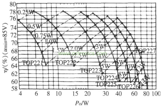 例如,設(shè)計(jì)輸出5 V, 30 W 的通用開關(guān)電源時(shí),就要選擇圖3.因?yàn)橥ㄓ瞄_關(guān)電源輸入交流電壓范圍85~ 265 V.首先從橫坐標(biāo)上找到Po = 30 W 的輸出功率點(diǎn),然后垂直上移,與T OP224 的實(shí)線相交于一點(diǎn),由縱坐標(biāo)上查出該點(diǎn)的η= 71.2%,最后從經(jīng)過(guò)這點(diǎn)的那條等值線上,查得PD = 2.5 W.這表明,選擇TOP224 就能輸出30 W 功率,并且預(yù)期的電源效率為71.2%,芯片功耗為2.5 W.如果覺(jué)得指標(biāo)效率偏低,還可以繼續(xù)往上查TOP225 的實(shí)線。同理,選擇TOP225 也能輸出30 W 的功率,而預(yù)期的電源效率可以提高到75%,芯片功耗可以降低1.7 W.然后根據(jù)所得到的PD 值,還可以進(jìn)而完成散熱片設(shè)計(jì)。