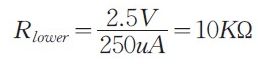 假設(shè)流經(jīng)橋分壓器的電流為250uA,由于TL431 的參考電壓為2.5V,則: