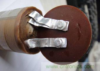 去掉固定的電子膠帶,就可以拆開內(nèi)部的鋁箔卷了。拆開后可以看紙張的材質(zhì)是否均勻,鋁箔是否有明顯的劃痕黑斑等。打開到引線的時(shí)候,可以看看刺鉚的是否牢靠,大型的引線可能會有很多對,那是增加輸出電流降低內(nèi)阻用的。大型的電解引條是純鋁條,多半是用超聲波壓接的方式,看不到小孔,但是連接的更牢靠。