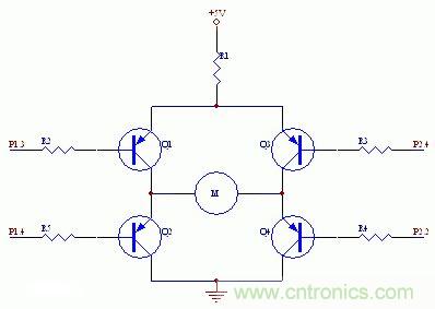 如下圖所示,些電路是作者最初設(shè)計(jì)的電路,P1.3、P2.2和P2.4分別是51單片機(jī)的IO引腳。設(shè)計(jì)的工作原理是:當(dāng)P1.3高電平、P2.2和P2.4都為低電平時(shí),電機(jī)正轉(zhuǎn)。此時(shí),Q1和Q4導(dǎo)通,Q2和Q3截止,電流注向?yàn)椋?VàR1àQ1àMàQ4;當(dāng)P1.3低電平、P2.2和P2.4都為高電平時(shí),電機(jī)反轉(zhuǎn)。此時(shí),Q2和Q3導(dǎo)通,Q1和Q4截止。P2.2為高電平同時(shí)P2.4為低電平時(shí),電路全不通,電機(jī)停止。圖中電阻:R1=20Ω,R2=R3=R4=510Ω