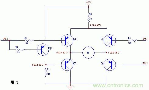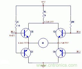 但實(shí)際實(shí)驗(yàn)情況去出人意料,即電機(jī)正向和反向都不轉(zhuǎn)。經(jīng)測(cè)量,當(dāng)P1.3高電平,P2.2和P2.4都為低電平時(shí),Q4導(dǎo)通,但Q1不導(dǎo)通,P1.3的電平只有0.67V左右,這樣Q1無(wú)法導(dǎo)通。