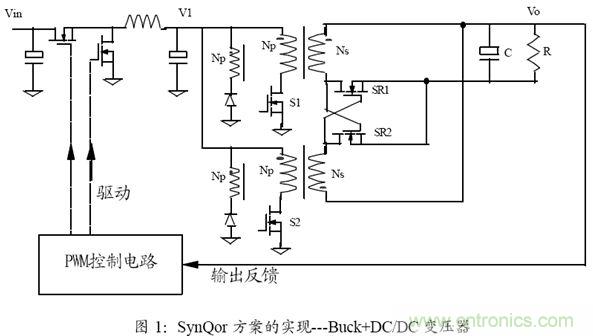 標(biāo)準(zhǔn)DC/DC 二次電源(半磚,1/4 磚)模塊,采用了Buck 與DC/DC 變壓器相級(jí)聯(lián)的兩級(jí)電路方案,如圖(1)所示。初初一看,這個(gè)方案比單級(jí)方案(如有源箝位正激電路)的元器件數(shù)要多,不太合理。但通過(guò)分析,可以發(fā)現(xiàn):其功率器件的總數(shù)并沒(méi)有增加(因?yàn)樵诘蛪捍箅娏鬏敵龅膽?yīng)用場(chǎng)合,輸出同步整流MOSFET 即使在單級(jí)方案中也要多個(gè)并聯(lián)才能實(shí)現(xiàn)效率指標(biāo));磁芯和電容元件的總面積也沒(méi)有增加(因?yàn)榭梢杂酶〉拇判竞碗娙荩5捎趦杉?jí)方案容易優(yōu)化和設(shè)計(jì),故模塊的電氣性能得到了極大的改善,具體分析見(jiàn)下面的介紹。