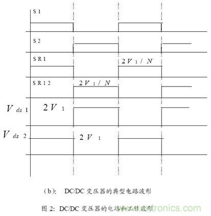 這個(gè)方案的第一級(jí)是一個(gè)同步整流Buck 變換器,它將不穩(wěn)定的輸入電壓,調(diào)整到后級(jí)DC/DC 變壓器所合適的輸入電壓,通過(guò)反饋輸出和誤差放大等,去控制Buck 變換器的PWM占空比,從而穩(wěn)定輸出。DC/DC 變壓器的電路和工作波形如圖2 所示: