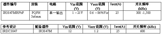 IR3847采用纖巧的PQFN 5×6mm 封裝,為15A 至 25A應(yīng)用帶來市場領(lǐng)先的電氣性能和熱性能,比如可以實現(xiàn)超過96%的尖峰效率,在25A下溫度僅上升50°C等。新器件的其它增強性能還包括外同步、排序、VTT跟蹤和輸出電壓極限。