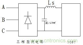 在此應(yīng)用場(chǎng)合中,可以視IGBT逆變器為整流電路的負(fù)載,此開(kāi)關(guān)器件負(fù)載具有突變電流,而根據(jù)公式(1)可知