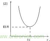 由上式可知,電容器的阻抗不僅與電容量有關(guān),同時(shí)還與等效串聯(lián)電阻、雜散電感、系統(tǒng)頻率有關(guān)。其阻抗|Z|與頻率的關(guān)系曲線見(jiàn)圖2所示