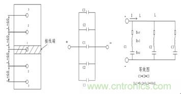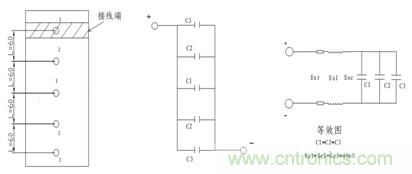 由圖6可知,同樣的器件,但是連接不同,其等效電路圖也不一樣。其條件同原有方案一樣,但其等效感抗不一樣。有等效電路圖可知,XL1=XL2=XL3=2πfL,而Esr和Esc三者數(shù)值相等,因此流經(jīng)每個(gè)電容的電流I=U/R=40A。這樣能使電流均勻地分布到每個(gè)電容上。這樣,就解決了電流分布不均而使電容部分電容發(fā)熱嚴(yán)重的問(wèn)題。
