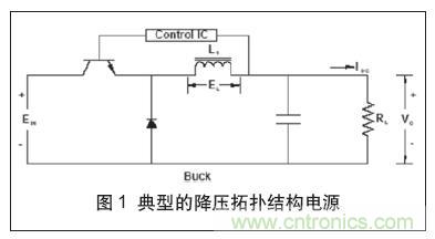 圖1所示為一個降壓拓撲結構電源的架構,該構架廣泛應用于輸出電壓小于輸入電壓的系統(tǒng)。在典型的降壓拓撲結構電路中,當開關(Q1)閉合時,電流開始通過這個開關流向輸出端,并以某一速率穩(wěn)步增大,增加速率取決于電路電感。根據(jù)楞次定律,di=E*dt/L,流過電感器的電流所發(fā)生的變化量等于電壓乘以時間變化量,再除以這個電感值。由于流過負載電阻RL的電流穩(wěn)定增加,輸出電壓成正比增大。