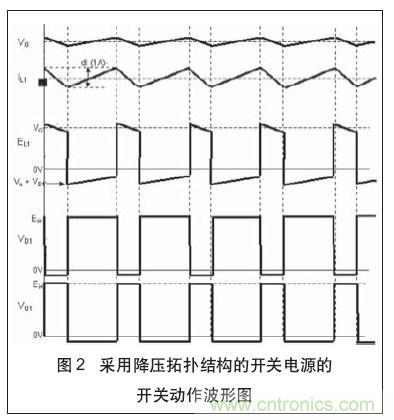 在達到預定的電壓或電流限值時,控制集成電路將開關斷開,從而使電感周圍的磁場衰減,并使偏置二極管D1正向導通,從而繼續(xù)向輸出電路供給電流,直至開關再度接通。這一循環(huán)反復進行,而開關的次數(shù)由控制集成電路來確定,并將輸出電壓調控在要求的電壓值上。圖2所示為在若干個開關循環(huán)周期內,流過電感器和其它降壓拓撲電路元件上的電壓和電流波形。