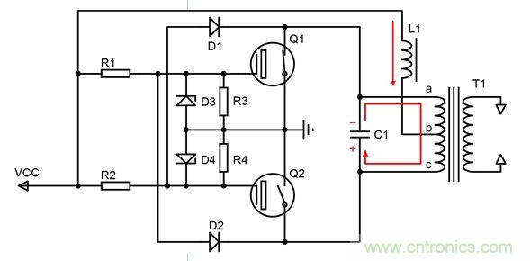 7. (圖3)由于T1對C1的持續(xù)充電,C1上電壓為a正c負(fù),通過兩個(gè)二極管使Q2柵極電壓升高,Q1柵極逐漸下降,同時(shí)正反饋形成,Q2導(dǎo)通,Q1截止。