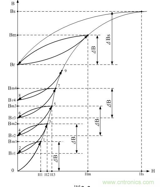 在磁場強度H的作用下,變壓器鐵芯中的磁感應(yīng)強度B將會按圖2-2中0-1磁化曲線上升;當(dāng)?shù)谝粋€直流脈沖電壓將要結(jié)束時,磁場強度達到第一個最大值Hm1,同時磁感應(yīng)強度將會被磁場強度磁化到第一個最大值Bm1 ;由此產(chǎn)生一個磁感應(yīng)強度增量ΔB, 。磁感應(yīng)強度增加,表示流過變壓器初級線圈中的勵磁電流產(chǎn)生的磁場在對變壓器鐵芯進行充磁。