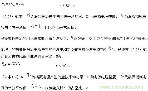 順便指出:(2-79)式的結(jié)果,是認(rèn)為渦流損耗在t1-t2期間(圖2-27-b)完全等于0而求得的,但實(shí)際上,在t1-t2期間變壓器初級(jí)線圈產(chǎn)生的反電動(dòng)勢同樣也會(huì)在變壓器鐵芯中感應(yīng)產(chǎn)生渦流損耗電流,即當(dāng)輸入電壓為0時(shí)刻,在變壓器鐵芯中還存在很短暫時(shí)間的渦流損耗;由于這種渦流損耗是由反電動(dòng)勢提供能量來維持的,它將隨著反電動(dòng)勢能量的衰減很快就衰減到0。