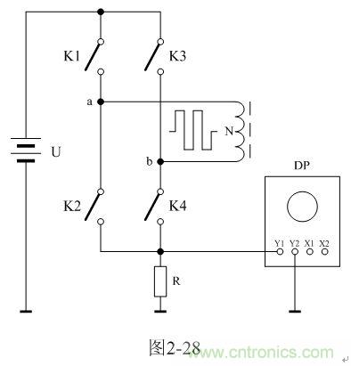 圖2-28中,U是電源電壓,N為變壓器初級(jí)線圈,控制開關(guān)K1、K2、K3、K4組成橋式開關(guān)控制電路,K1和K4為一組,K2和K3為一組,兩組開關(guān)輪流接通與斷開,把電源電壓正反向加于變壓器初級(jí)線圈兩端;R為取樣電阻,通過測量R兩端的電壓,就可以知道流過變壓器初級(jí)線圈的電流;取樣電壓被送到示波器DP進(jìn)行顯示。