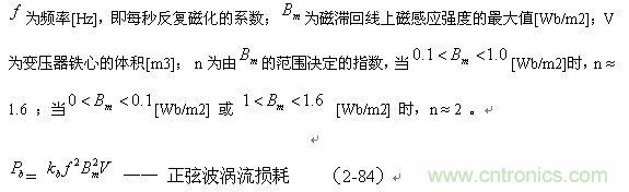 當(dāng)加到變壓器初級(jí)線圈兩端的電壓為正弦波時(shí),變壓器鐵芯的磁滯損耗和渦流損耗可分別用下面的(2-83)和(2-84)經(jīng)驗(yàn)公式進(jìn)行估算:
