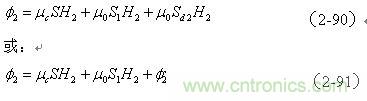 (2-91)式中,咋看起來,變壓器初級線圈N1產(chǎn)生的磁通量 全部穿過變壓器次級線圈N2,它們之間應(yīng)該不存在漏磁通;但是,初級線圈在面積S1中產(chǎn)生的磁通 的方向與在面積Sd2中產(chǎn)生的磁通 的方向,正好互相相反;因此,變壓器初級線圈N1在面積Sd2中產(chǎn)生的磁通 ,仍然稱為變壓器初級線圈N1對變壓器次級線圈N2的漏磁通,其等效電感同樣稱為漏感。
