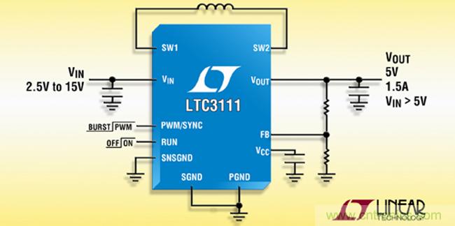 凌力爾特 (Linear) 推出同步降壓-升壓型轉(zhuǎn)換器 LTC3111,該器件可在很寬的電源范圍內(nèi)工作,包括單節(jié)或多節(jié)電池、超級電容器組和交流適配器,提供高達(dá) 1.5A 輸出電流。LTC3111 的輸入和輸出電壓范圍為 2.5V 至 15V,從高于、低于或等于穩(wěn)壓輸出的輸入電壓提供穩(wěn)壓輸出。該器件采用的低噪聲降壓-升壓型拓?fù)湓诮祲汉蜕龎耗J街g提供連續(xù)和無抖動的轉(zhuǎn)換,從而使其非常適用于 RF 和其他噪聲敏感型應(yīng)用,這類應(yīng)用在使用可變輸入電源時(shí),必須保持低噪聲和恒定的輸出電壓。