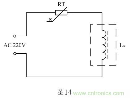 開關(guān)變壓器退磁的最好的方法是讓開關(guān)變壓器初級線圈在非常短的時間內(nèi)通過一個幅度為3~5倍Imax(極限電流)的阻尼振蕩電流。因此,可用一個20~40歐姆的消磁熱敏電阻(可用兩個消磁熱敏電阻串聯(lián))與開關(guān)變壓器的初級線圈串聯(lián),然后接到110~220V/50Hz交流電源上,大約只需要20多秒鐘,待消磁熱敏電阻完全加熱后,即可達(dá)到退磁的目的,如圖14所示。在圖14中,RT為熱敏電阻,Lx為開關(guān)變壓器的初級線圈。