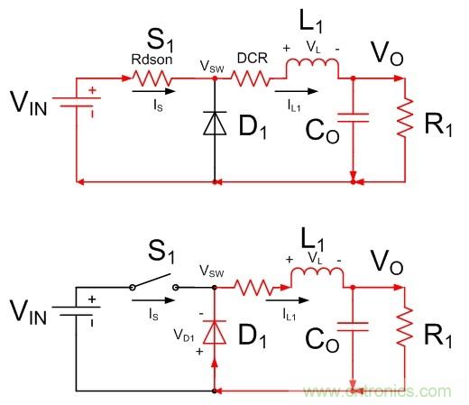 88%只是理想情況下的理論計(jì)算值。實(shí)際中,需要考慮續(xù)流二極管D1的壓降,開(kāi)關(guān)管S1的導(dǎo)通壓降,以及電感L1的直流阻抗的壓降,如圖3所示。
