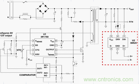 圖8 為基于Dialog 公司2014年初推出的iw620+iw1760的快速充電設(shè)計(jì)方案實(shí)物圖,電路的設(shè)計(jì)思路為iW620快速充電接口IC可以通過USB數(shù)據(jù)線檢測到支持Quick Charge 2.0的移動設(shè)備發(fā)出的指令,然后與iW1760 PWM原邊控制器進(jìn)行通信,對電源適配器輸出電壓進(jìn)行配置。位于初級側(cè)的iW1760就可提供電流感應(yīng)。通過其可編程的主動快速放電專利技術(shù)能將輸出電壓從9V或12V降至5V, 因此,當(dāng)用 戶拔掉連接Quick Charge 2.0手機(jī)的USB數(shù)據(jù)線,再將其連接至非Quick Charge 2.0手機(jī)時,iW620可以迅速把輸出電壓降至5V,避免對其造成損壞。