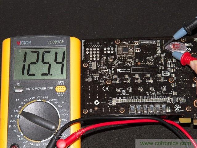 焊接完成后一是要用放大鏡配合電路圖仔細(xì)的測量各個元器件之間的連接關(guān)系,確定有無短路和虛焊。另外一個簡單的辦法就是通過直接測量供電回路的電阻值(關(guān)機(jī)狀態(tài)下)來確定是否有明顯的焊接失誤。通常來說GPU核心供電回路的電阻值在1歐姆到10幾歐姆之間,而顯存供電回路則是100-140歐姆左右。至于測量點(diǎn),選擇核心和顯存供電模塊輸出電容的兩個引腳就可以了??梢钥吹礁脑烨昂蠛诵摹@存供電回路的電阻值都在4.8歐/125歐左右,因此焊接是沒有問題的。