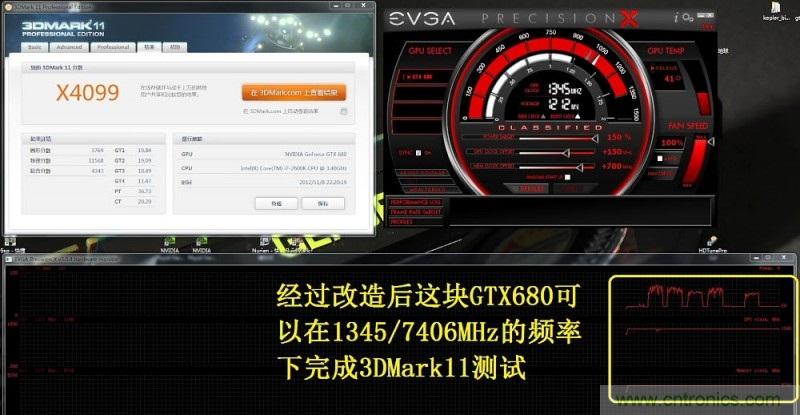 同時,改造以后在原裝散熱器條件下,可以以1345MHz的核心頻率完成3D Mark11測試,取得x4099的高分。而在改造之前雖然也能用1345MHz跑完測試,不過跑的不是特別順利,得跑幾次才能過一次。這應(yīng)該是通過改造降低了供電紋波電流的功勞,可惜手邊沒有示波器,要不就能量化一下改造的效果了。