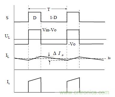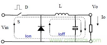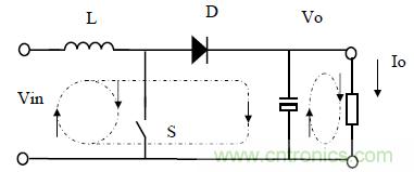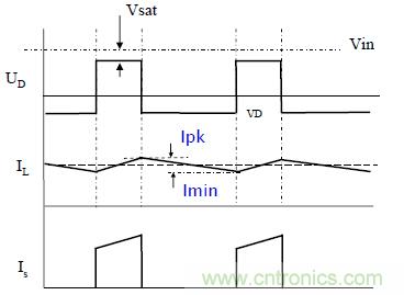 在這階段,電流波形是一條斜率為負(fù)的斜線,斜率為-Vout/Lo。當(dāng)開關(guān)再次導(dǎo)通時(shí),二極管迅速關(guān)斷,電流從輸入電源和開關(guān)管流過(guò)。在開關(guān)導(dǎo)通前瞬間,電感上的電流Imin就是開關(guān)管通過(guò)的初始電流。