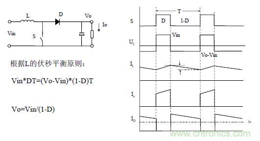 升壓變換器與BUCK變換器有著相同的組成部份,只是它們的位置被重新布置了一下。新的布局使變換器與正激式變換器的工作過(guò)程完全不同。在這種情況下,開關(guān)管導(dǎo)通時(shí),電流環(huán)路僅在包括電感,開關(guān)管和輸入電壓源。在這段時(shí)間中,二極管是反向阻斷的。電感電流波形也是以固定斜率上升,可用下式描述: