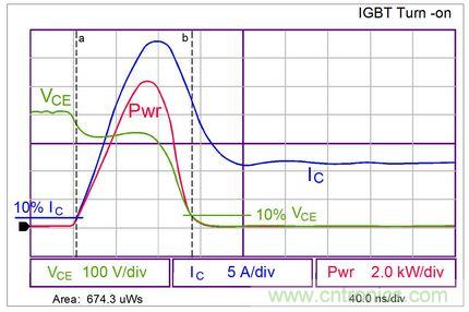 導(dǎo)通時(shí),應(yīng)當(dāng)量測(cè)起于IC電平10%終于10% VCE點(diǎn)的損耗。這些電平等級(jí)相當(dāng)標(biāo)準(zhǔn),雖然這樣說也有些主觀性。如果需要的話,也可以使用其他點(diǎn)。無論選擇何種電平來量測(cè)不同間隔,重要的是保持一致,使從不同 組件獲取的數(shù)據(jù)能夠根據(jù)相同的條件來比較。功率根據(jù)示波器波形來計(jì)算。由于它并非恒定不變,且要求平均功率,就必須計(jì)算電源波形的積分,如波形跡線的底部 所示,本案例中為674.3 μW(或焦耳)。