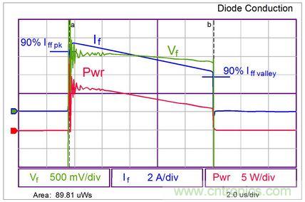 必須獲取在開關(guān)周期的部分時(shí)段(此時(shí)電流為無功模式使二極管導(dǎo)電)時(shí)的二極管導(dǎo)通損耗資料。通常量測(cè)峰值、負(fù)及反向?qū)щ婋娏?0%點(diǎn)的資料。