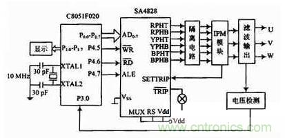 以SA4828與單片機(jī)C8051F020為核心構(gòu)成的控制器電路設(shè)計如圖4所示??刂齐娐犯鶕?jù)給定的參數(shù)輸出三相SPWM信號給智能功率模塊IP-M,實現(xiàn)對功率晶體管的通斷控制。C8051F020通過8位P0端口與SA4828的地址、數(shù)據(jù)管腳AD0~AD7相連,工作時,單片機(jī)首先對SA4828進(jìn)行初始化,定義載波頻率,電源頻率范圍、死區(qū)、最小脈沖取消時間等參數(shù)。然后向SA4828的控制寄存器傳送電源的頻率控制字和幅度控制字等參數(shù)。正常工作時,根據(jù)需要對SA4828的控制數(shù)據(jù)進(jìn)行修改,實現(xiàn)系統(tǒng)的反饋與實時控制,以及調(diào)壓控制。為實現(xiàn)系統(tǒng)的穩(wěn)壓功能,采用平均值反饋PI調(diào)節(jié)。輸出電壓經(jīng)隔離送入C8051F020單片機(jī)的A/D轉(zhuǎn)換口即P3.0口,轉(zhuǎn)換結(jié)果參與PI運算,運算結(jié)果即為SA4828幅度控制寄存器的控制字。從RPHT~BPHB的6個引腳輸出相應(yīng)頻率和電壓的SPWM控制信號,經(jīng)隔離電路后,分別控制智能功率模塊IPM的6個IGBT的導(dǎo)通與截止,最后在3個輸出端上產(chǎn)生對稱的三相SPWM電壓。SA4828作為單片機(jī)的外設(shè),與單片機(jī)并聯(lián),通過對單片機(jī)編程,只需將SPWM的初始化信息和控制信息寫入SA4828的相關(guān)寄存器,即產(chǎn)生精確的全數(shù)字化的三相的SPWM波形。