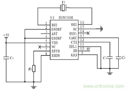 無線接收部分主要由解碼芯片SYN500R、晶振和外圍電路組成超外差接收模塊,接收模塊負(fù)責(zé)接收來自發(fā)送模塊的編碼,然后將編碼交由處理器處理,處理器處理后通過放大器將信號(hào)放大,然后控制繼電器的開和合,接收部分電路圖如圖4所示。