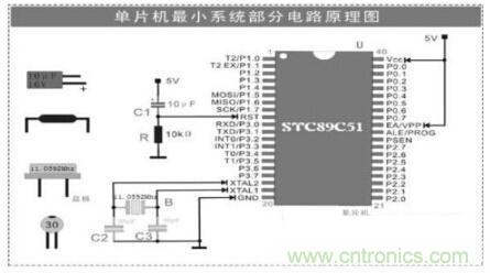 STC89C51使用11.0592MHz的晶體振蕩器作為振蕩源,由于單片機(jī)內(nèi)部帶有振蕩電路,所以外部只要連接一個(gè)晶振和兩個(gè)電容即可,電容容量一般在15pF至50pF之間。