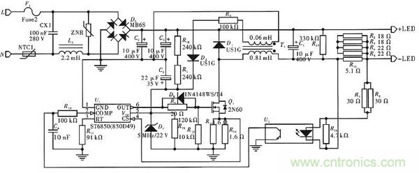LED節(jié)能燈的快速發(fā)展,使得LED驅(qū)動電路的設(shè)計更加嚴格,整個電路不僅要安全低功耗,還應(yīng)該具有恒流特性,即電源電壓變動幅度<15%時,輸出電流的變化幅度不超過10%,這樣才能保證LED驅(qū)動電路較高的能量利用效率。