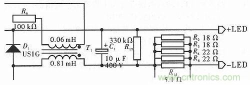 如圖2所示,此電路通過變壓器輸出適當?shù)碾娏?,當有LED負載時,電路中通入適當?shù)碾娏骱皖l率使LED正常工作;當沒有負載時,變壓器中仍然殘留有能量,需要釋放。此時由R17等構(gòu)成的回路,可以慢慢地釋放變壓器中的電能。但當電流突然減小時,變壓器中會產(chǎn)生感應(yīng)電動勢,由此會產(chǎn)生較高的反向電壓,可能會擊穿器件。為了克服這個問題,在線圈的兩端并聯(lián)一個續(xù)流二極管D1,同時在電路輸出端串聯(lián)R15,并且在R15兩端并聯(lián)R2,R3,R4,R6。R15有降壓作用,并且能為反饋電路提供電壓。由于R15承受的功率較大,容易燒壞,所以預(yù)備一個由R2,R3,R4和R6的并聯(lián)等效電阻,這樣每個電阻承受的功率變小,在增加使用壽命的同時,能夠減少維修費用。