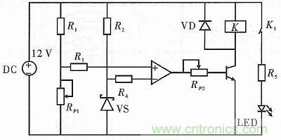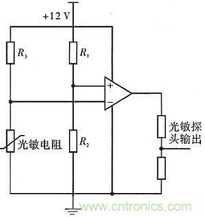 其由光電轉(zhuǎn)換模塊和光敏電阻組成。光電轉(zhuǎn)換由比較器來實現(xiàn)。當光敏探頭感應(yīng)的光照強度不強時,比較器會輸出高電位,否則輸出低電位。具體電路如圖6所示。R1分擔電路電壓,依照外界環(huán)境條件,選擇適當?shù)碾娮鑂2,控制比較器中正相輸入的電壓值,使其作為比較器工作的參考電壓;R3起到保護光敏電阻以及分壓的作用。光敏電阻的阻值隨著外界光強的變化而變化,這樣就可將光信號變換成電壓信號,以此作為信號電壓連接到比較器的反相輸入端。比較兩個輸入端的電壓大小。若信號電壓較小,比較器輸出高電平,否則比較器輸出低電平。從而實現(xiàn)在明亮條件下輸出低電平,在黑暗條件下輸出高電平的設(shè)計要求。