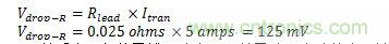 以一個(gè)具有25A供電,伴有5A瞬變電流的負(fù)載應(yīng)用為例。其中,電源電壓設(shè)為 2.5V,通過5英尺長(zhǎng)的14AWG布線連接至IC測(cè)試板。由于是低電壓供電,如果電壓有超過100mV的跌落,通常是不可接受的。14AWG線每英尺的電阻為2.5mΩ,由此,在電源輸出和IC測(cè)試板之間的導(dǎo)線回路存在25mΩ電阻。根據(jù)歐姆定律,我們可以計(jì)算出導(dǎo)向回路上可能出現(xiàn)的壓降: