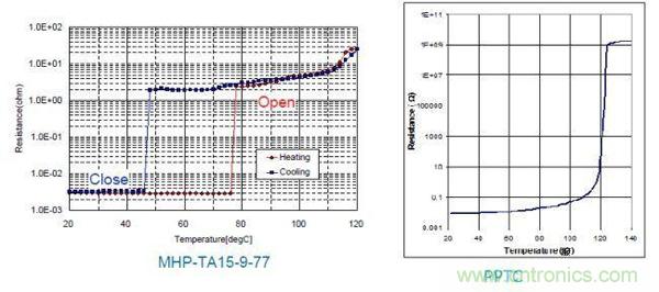 因此,不論哪種方式的快速充電,都是通過提高充電電流或功率來加速鋰電池芯內(nèi)部的反應(yīng)來實(shí)現(xiàn)的,必須通過更多的保護(hù)來防止由于電池芯的熱失控而引起的起火甚至爆炸。TE的PPTC和MHP-TA 可以有效地提供這種保護(hù),MHP-TA是結(jié)合了雙金屬片和PPTC的溫度/電流保護(hù)器件,溫度保護(hù)更加精確,可以適用于電流較大、溫度保護(hù)要求更高的電子設(shè)備,如:智能手機(jī)、平板電腦、超級本、筆記本電腦等。MHP-TA及PPTC的特性及應(yīng)用如下圖,緊貼電池芯的設(shè)計(jì)可以使MHP-TA和PPTC更好的感測電池溫度,當(dāng)電池溫度異常升高時(shí)可以呈現(xiàn)高阻,阻礙電池的充放電電流,確保電池的安全使用。