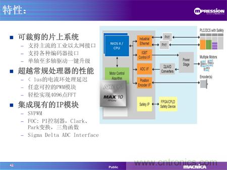 同期推出的還有駿龍科技基于MAX® 10 FPGA的電機驅(qū)動方案,通過FPGA實現(xiàn)馬達控制的算法核心,提供了高性能、定制化和單芯片的解決方案,為馬達控制帶來革命性的質(zhì)的飛躍。使用FPGA 替代傳統(tǒng)的CPU/DSP架構實現(xiàn)算法,意味著所有的算法都將通過硬件實現(xiàn),這樣由于處理能力限制而在CPU中無法實現(xiàn)的算法,現(xiàn)在都可以在MAX® 10 FPGA中以輕松地實現(xiàn)。Altera的MAX 10支持EtherCAT、Powerlink、Mechatrolink等工業(yè)以太網(wǎng)接口以及Endat 2.2, BISS等編碼器接口,用戶可以該方案中實現(xiàn)靈活可定制的接口。該方案還提供可定制的調(diào)試界面,客戶可以根據(jù)自己的需求,定制自己的調(diào)試界面,實時觀測內(nèi)部信號。
