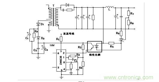 圖2 用UC3842驅(qū)動(dòng)開關(guān)電源構(gòu)成開關(guān)電源的原理圖