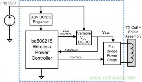 10W發(fā)射器系統(tǒng)運行在固定頻率下,但是卻使用一個可調(diào)前置穩(wěn)壓器來改變用于線圈激勵的直流電壓軌。一個全橋電路被用來生成用于TX線圈的交流激勵電流。圖2中顯示的是一個定頻(10W)無線充電發(fā)射器系統(tǒng)的基本方框圖。當RX需要更多的輸出功率時,直流電壓軌為TX線圈功率級提供的電壓會增加。直流電壓隨著RX負載的下降而減少。
