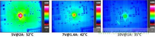 bq51025 10W無線接收器輸出電壓可在5V至10V的范圍內(nèi)用外部反饋電阻器進行調(diào)節(jié)。這樣就可實現(xiàn)對一節(jié)或兩節(jié)串聯(lián)電池配置的充電,并且在與一個寬輸入電壓范圍開關(guān)模式NVDC類型充電器組合在一起時,能夠保持單節(jié)電池充電情況下的高效率。在諸如無線RX輸出情況下,NVDC充電器架構(gòu)在減少較高電壓電源所需的輸入電流的同時,可實現(xiàn)低壓電池的高效充電。圖3顯示的是無線接收器電路板在為負載提供一個10W電源的同時,在5V,7V和10V輸出設置下的熱響應(分別為圖。 3a,b和c)。很明顯,10V輸出情況下產(chǎn)生的熱量最少,應該在高頻開關(guān)模式充電器可用于電池充電的情況下使用。
