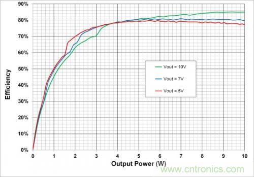 圖6.在5V,7V和10V輸出設置時,10W電源系統(tǒng)的端到端效率