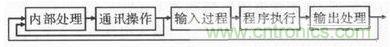 在延遲控制中,傳統(tǒng)的繼電器控制技術(shù)依靠設(shè)備的滯后性實現(xiàn),定時精度較差,在操作時不易調(diào)整時間。而PLC監(jiān)視控制是時鐘脈沖由晶體振蕩器引起的,可操控時間,且精度較高。PLC控制雖與微電腦技術(shù)相似,但工作方式卻不同。PLC技術(shù)采用循環(huán)掃描,而微機則采用鍵盤掃描,圖1是PLC技術(shù)的工作掃描方式。