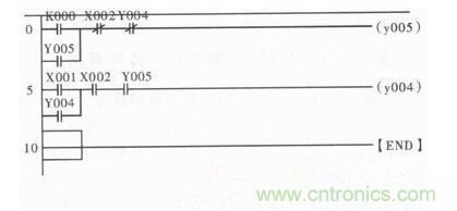在圖3梯形圖中,PLC外部按鈕所控制的常開觸點主要是左母線的第一等級以及第二等級的X001觸點和X002觸點,只需按鈕便可使得X000或X001任意一個常開觸點閉合,輸出繼電器Y005或繼電器Y004就能通過相應(yīng)線路形成閉合回路,進而使常開接觸點Y005或Y004實現(xiàn)自鎖功能同時實現(xiàn)電動機的正反轉(zhuǎn)。停止通過PLC外部的按鈕實現(xiàn),按鈕通過釋放X002常開接觸點,使得繼電器斷電引發(fā)電動機停止運轉(zhuǎn)。